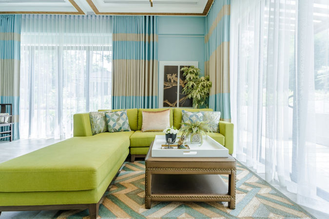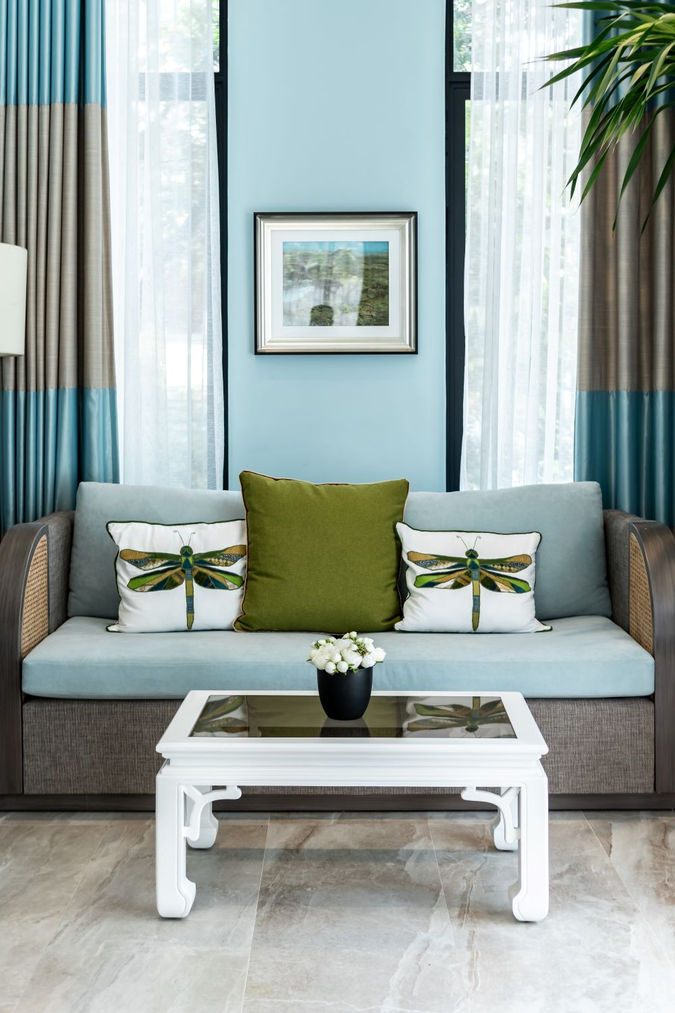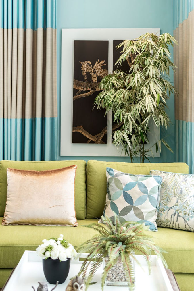 Upon entering this serenely modern Asian-inspired living room, a harmonious sanctuary where every design element converges to create a tranquil and sophisticated atmosphere. The predominant color scheme of calming greens and blues sets the stage for a space that exudes balance and peacefulness.
